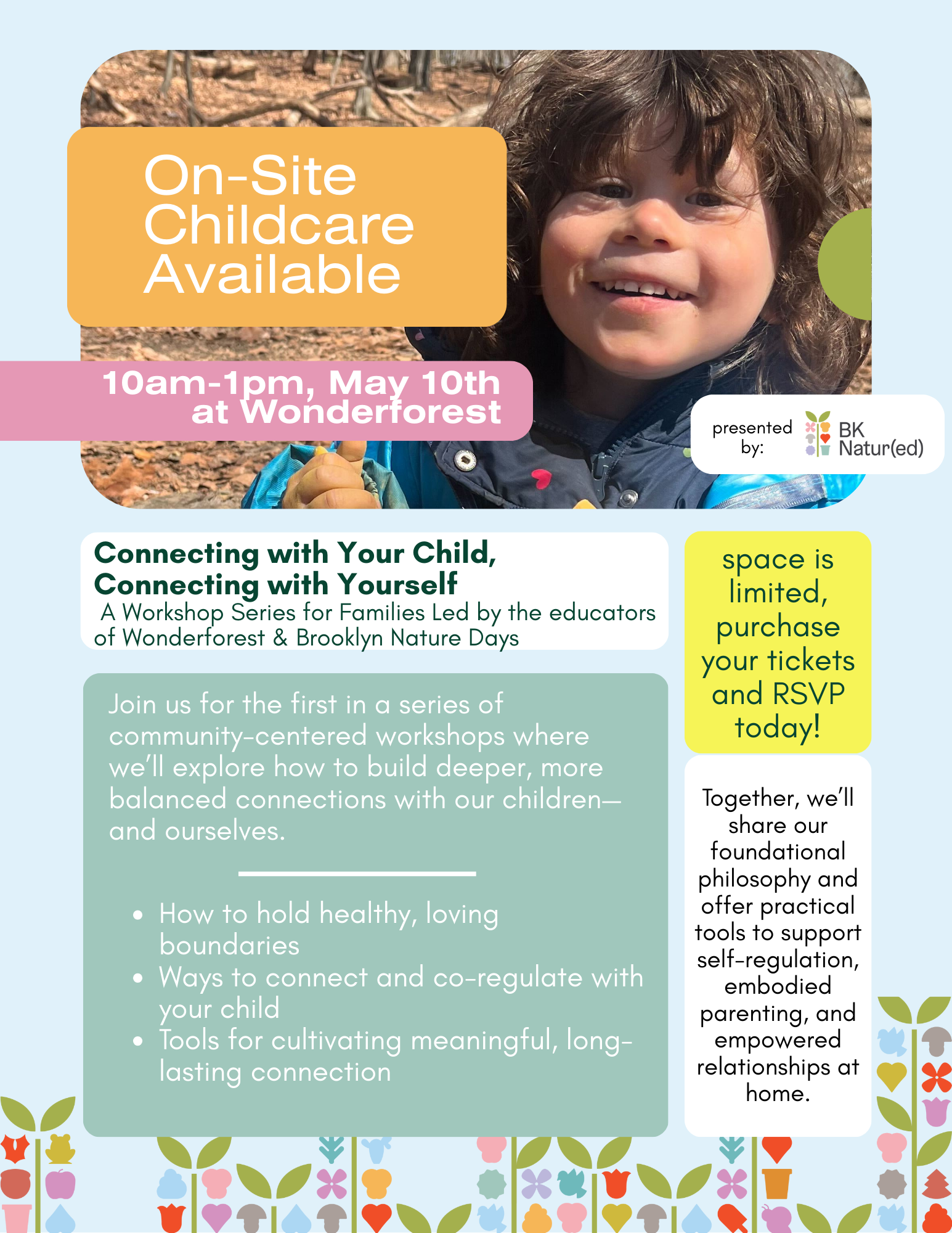 In this introductory session led by Wonderforest Founder Sarah Carlson & former Brooklyn Nature Days Director (current BKNatur(Ed) Director) Lilly Clark, we will share the core philosophy and foundational practices that guide our approach. Designed for families and caregivers, this workshop offers insight into how we can cultivate meaningful, lasting relationships with our children through a grounded and thoughtful approach.